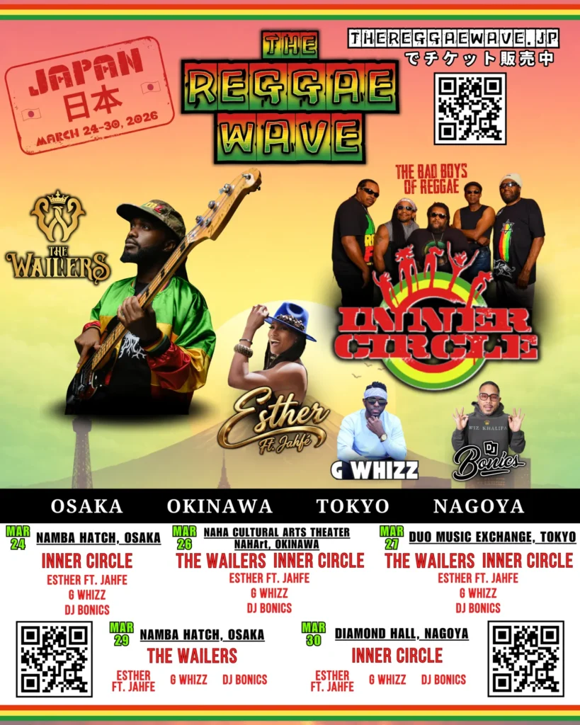 - 公演内容、公演日程、開場・開演時間、出演者等は、予告なく変更となる場合がございます。出演者や公演内容の変更による払い戻しはいたしかねます。なお、「THE REGGAEWAVE 2026」が開催中止となった場合は、ご購入いただいたチケット代金およびシステム利用料を全額返金いたします。中止や変更が発生した場合は、本URLまたは公式SNSにてご案内いたしますので、ご来場前に必ず最新情報をご確認ください。あわせて、ドメイン指定受信や迷惑メール設定をされている方は、「info@thereggaewave.jp」からのメールを受信できるよう設定をお願いいたします。